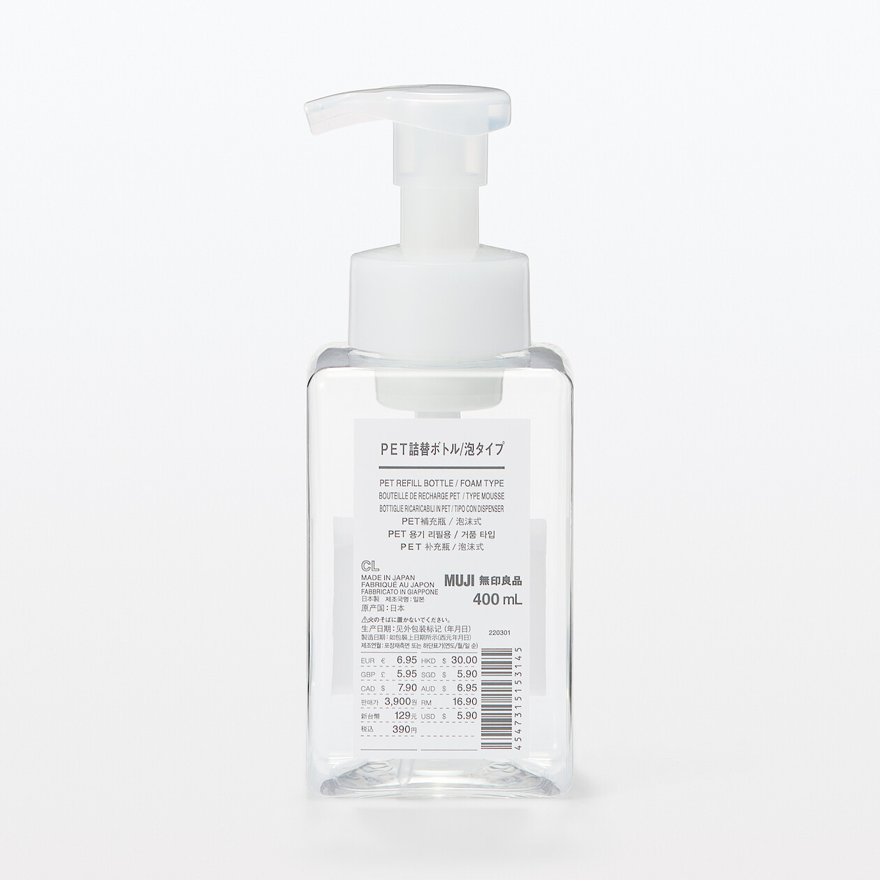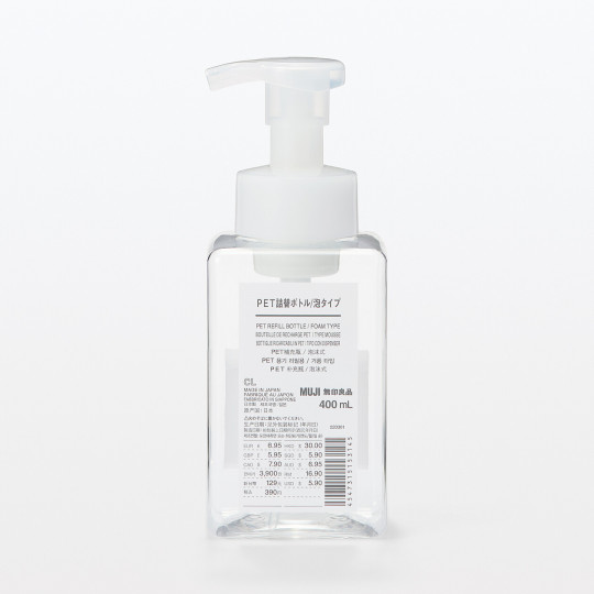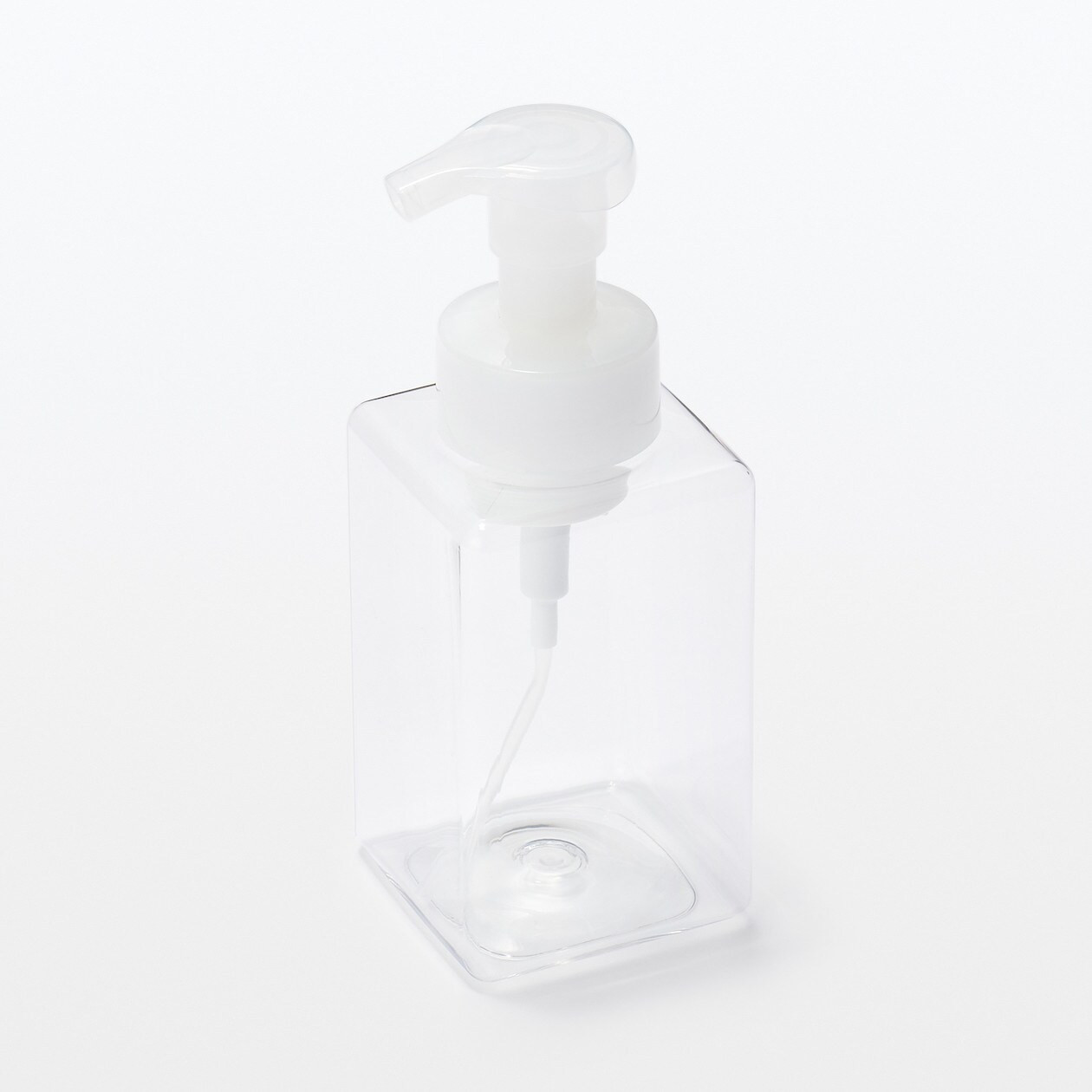 Przezroczysty pojemnik PET z dozownikiem pieniącym. Pompka pozwala zmniejszyć ilość zużywanego mydła nawet o 75%. Wystarczy wlać mydło do połowy pojemnika i uzupełnić wodą.