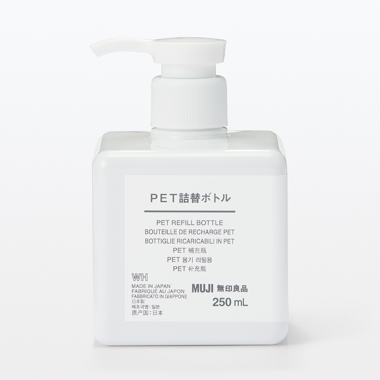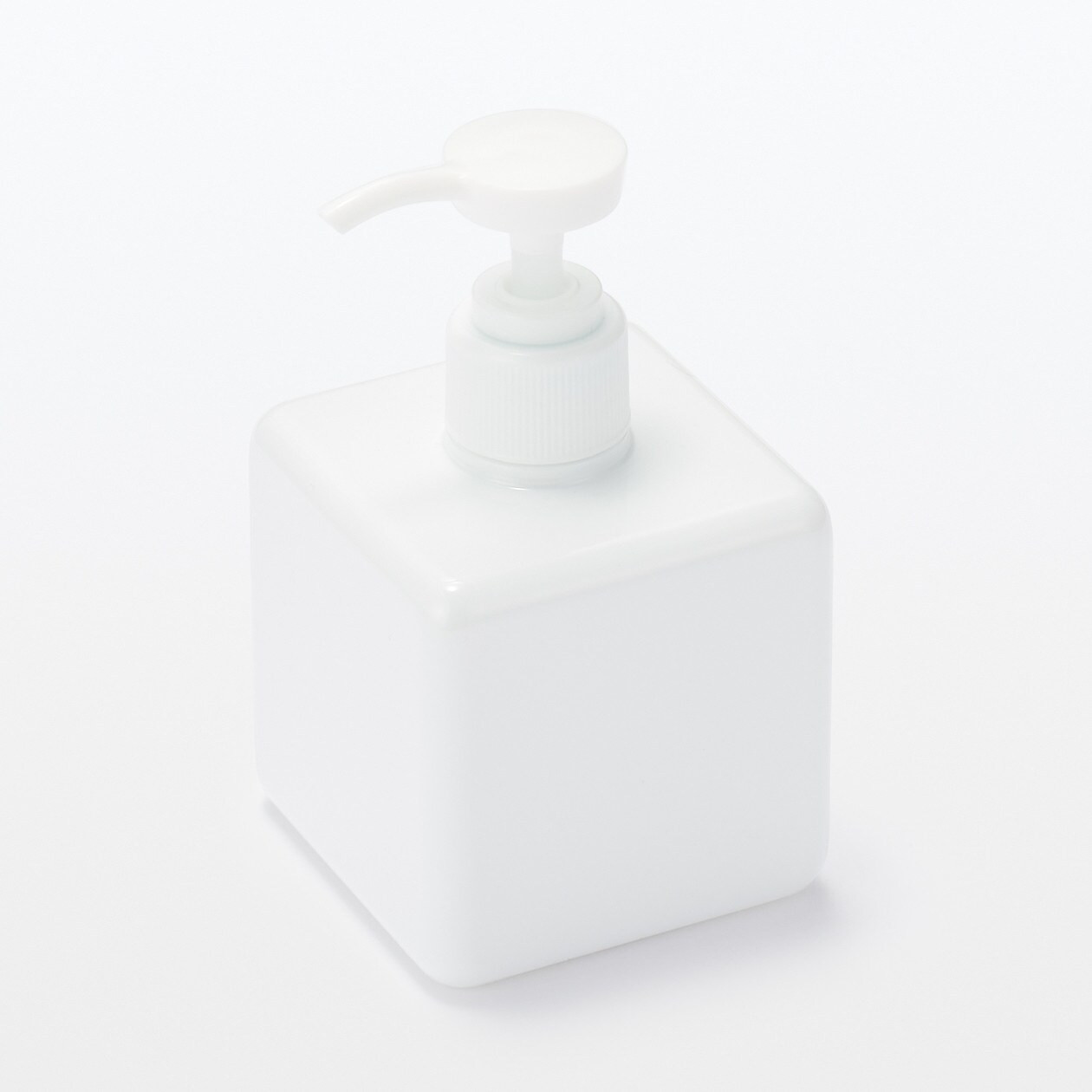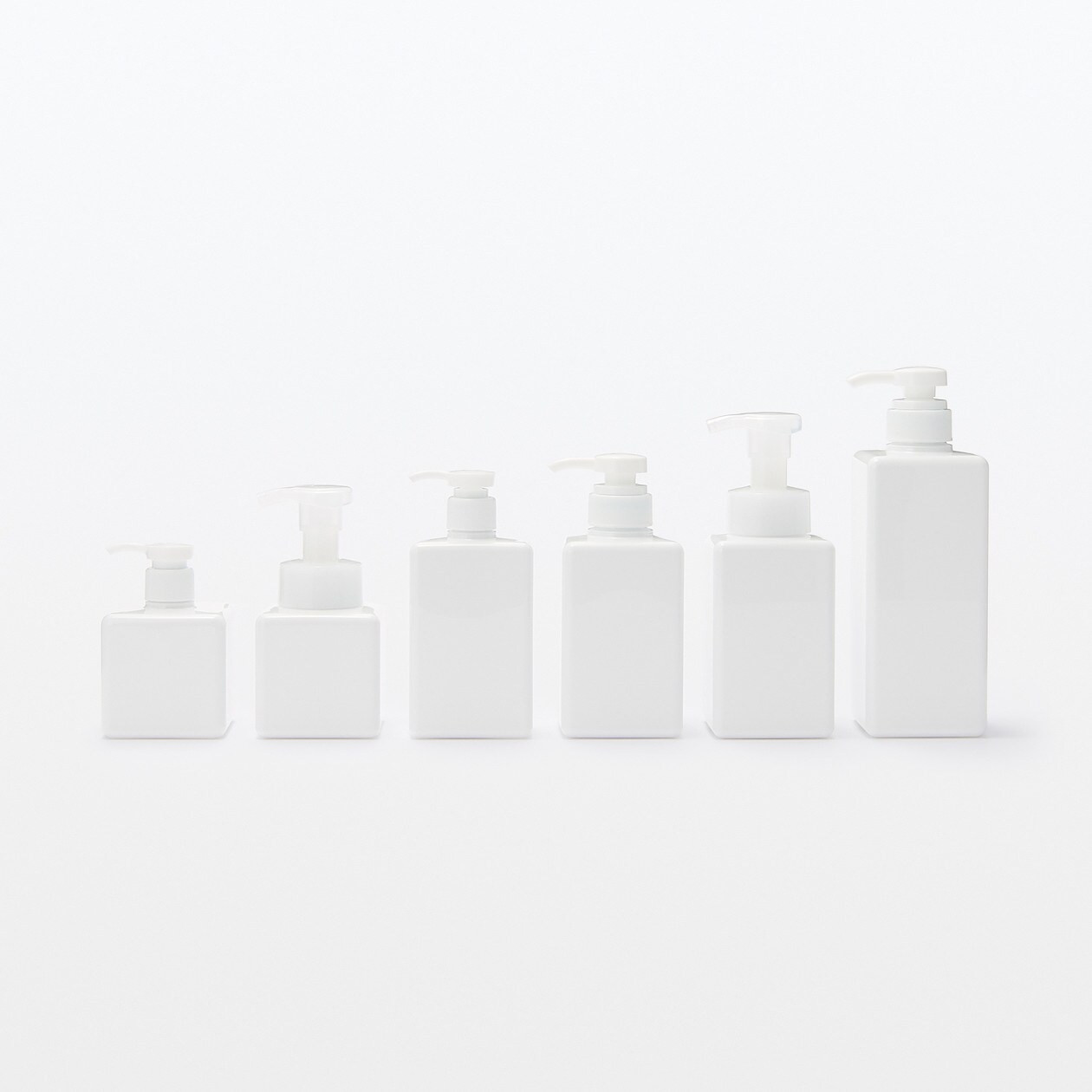 Biała plastikowa butelka z pompką, dostępna w 4 rozmiarach.