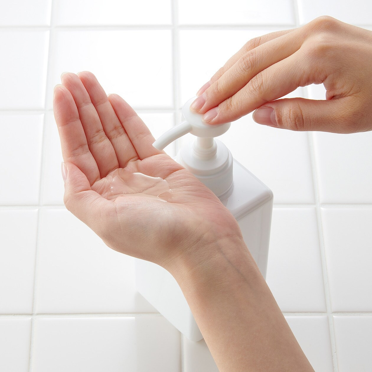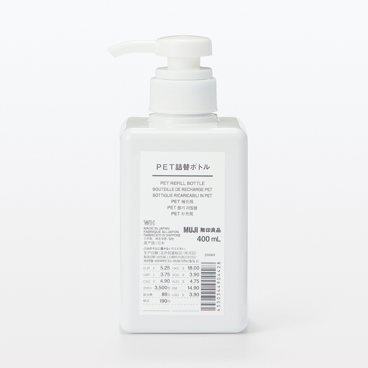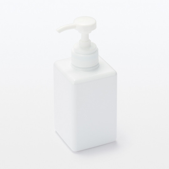 Biała plastikowa butelka z pompką, dostępna w 4 rozmiarach.