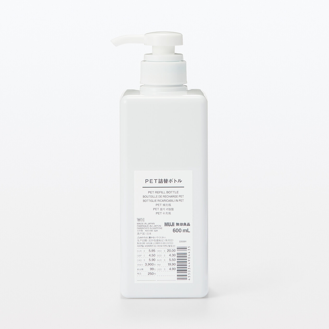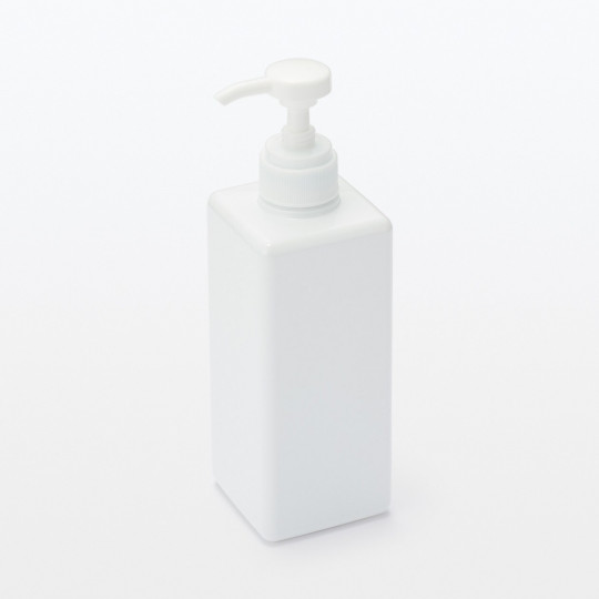 Biała plastikowa butelka z pompką, dostępna w 4 rozmiarach.