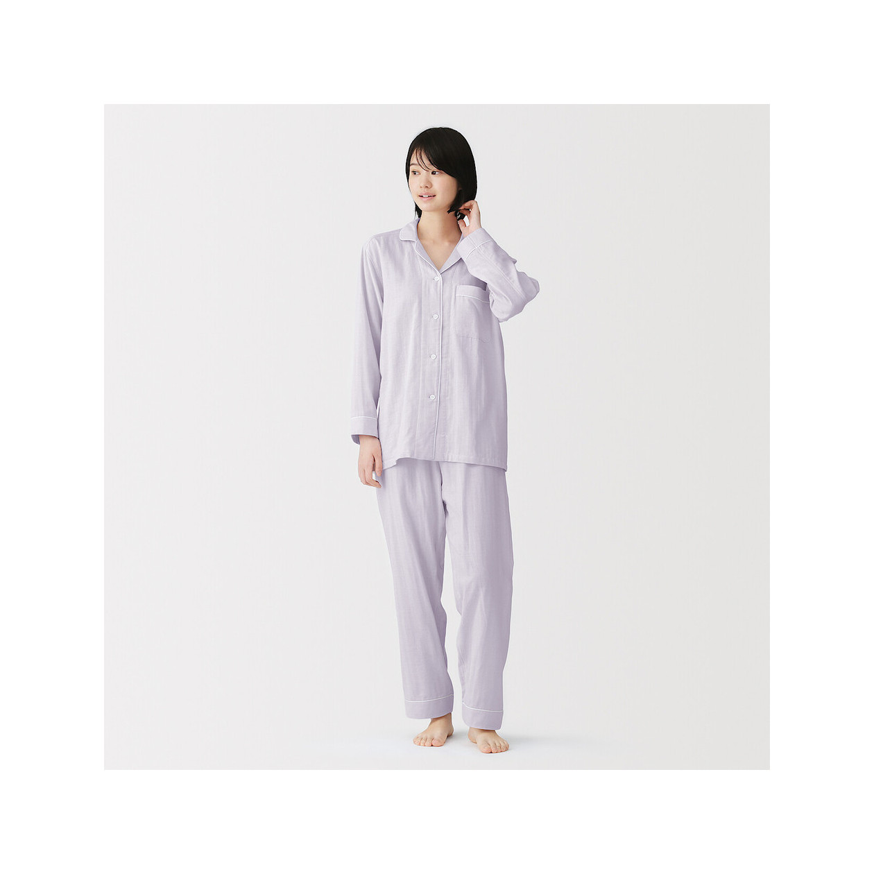 Delikatna dla skóry, stworzona do snu. Wykonana z dwóch warstw oddychającej muślinowej bawełny. Kołnierz można nosić otwarty lub zapięty. Brak bocznych szwów i metki przy szyi minimalizuje ryzyko podrażnień podczas odpoczynku.