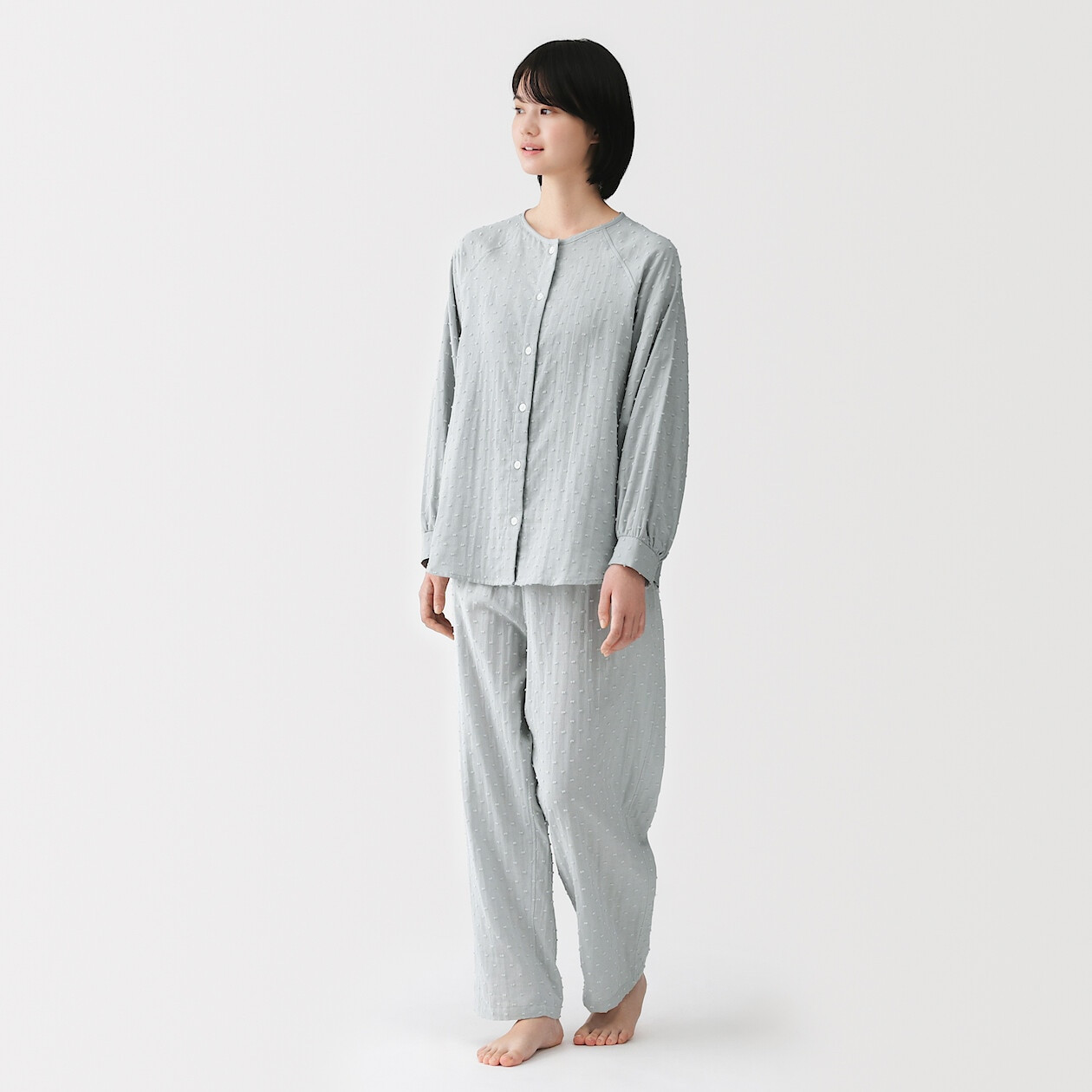Lekka dwuczęściowa piżama w kropki z bawełnianej podwójnej gazy gwarantuje pełną przewiewność i swobodę ruchów. Brak metek i kołnierza eliminuje ryzyko otarć, a funkcjonalne ściągacze przy nadgarstkach dbają o Twoją wygodę podczas wieczornego odpoczynku.