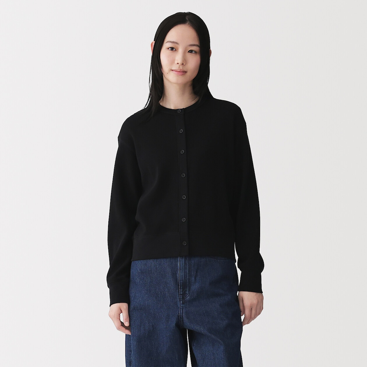 Lekki i miękki kardigan z okrągłym dekoltem, wykonany z przyjemnej w dotyku organicznej bawełny. Struktura typu waffle o nieregularnym splocie nie przylega do skóry, zapewniając komfort noszenia nawet w cieplejsze dni.