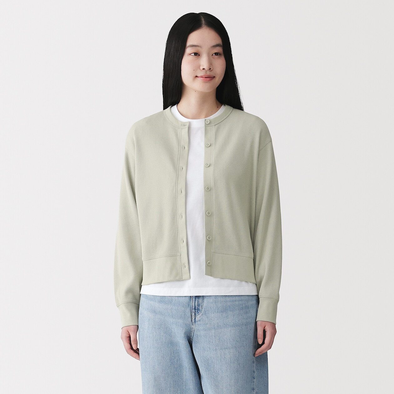 Lekki i miękki kardigan z okrągłym dekoltem, wykonany z przyjemnej w dotyku organicznej bawełny. Struktura typu waffle o nieregularnym splocie nie przylega do skóry, zapewniając komfort noszenia nawet w cieplejsze dni.
